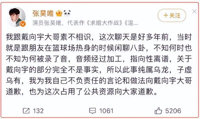 只是谁也没料到,就在去年,戴向宇被曝出“嫖娼门”,网上忽然出现一段疑似在《庆余年》里演“太子”的张昊唯和女生的对话录音,内容直指戴向宇嫖娼。