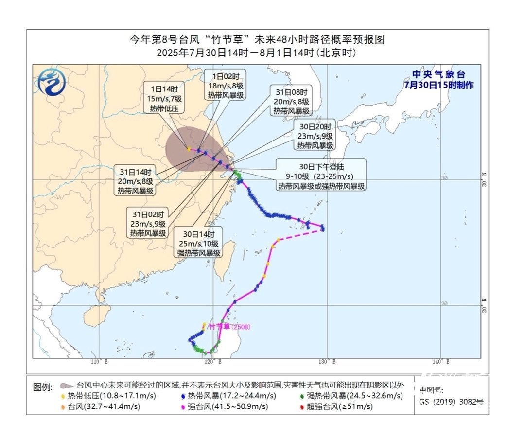 山东省气象台于7月30日16时50分发布台风蓝色预警和暴雨蓝色预警,继续发布海上大风黄色预警:今年第8号台风“竹节草”的中心已于30日16时40分前后在上海市奉贤区沿海再次登陆,登陆时减弱为热带风暴级,中心附近最大风力有9级(23米/秒),中心最低气压978百帕。预计未来“竹节草”将以每小时10~15公里的速度继续向西北方向移入江苏南部,强度逐渐减弱,于31日夜间移入安徽东部,之后在苏皖南部徘徊少动。