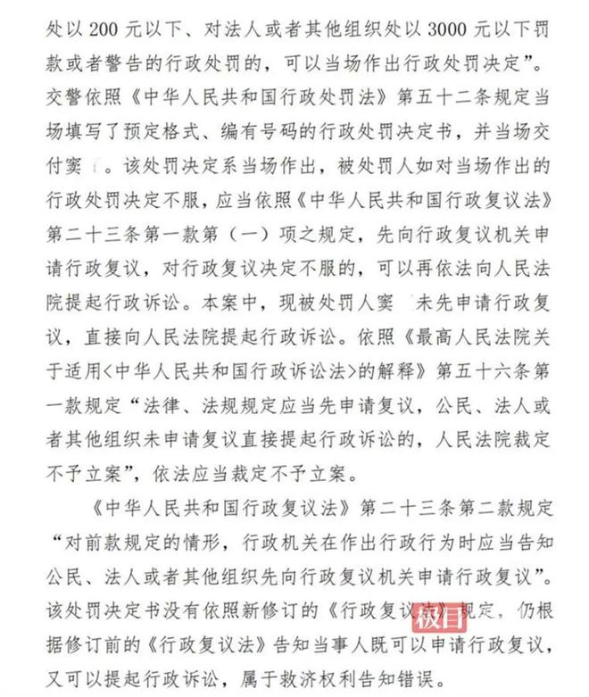 窦先生称,20日他已收到南郑区人民法院出具的行政裁定书,对他的起诉不予立案,“法院工作人员告诉我,根据最新规定,上述超速处罚是交警当场作出的,我如果不服,应先申请行政复议。对行政复议决定不服的,再依法向法院提起行政诉讼。”