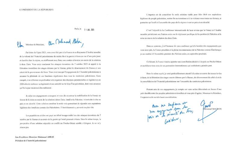 马克龙还同时公开了一封写给巴勒斯坦总统阿巴斯的正式信函,强调法国支持“两国方案”,并肯定阿巴斯在推动停火等方面作出的承诺。