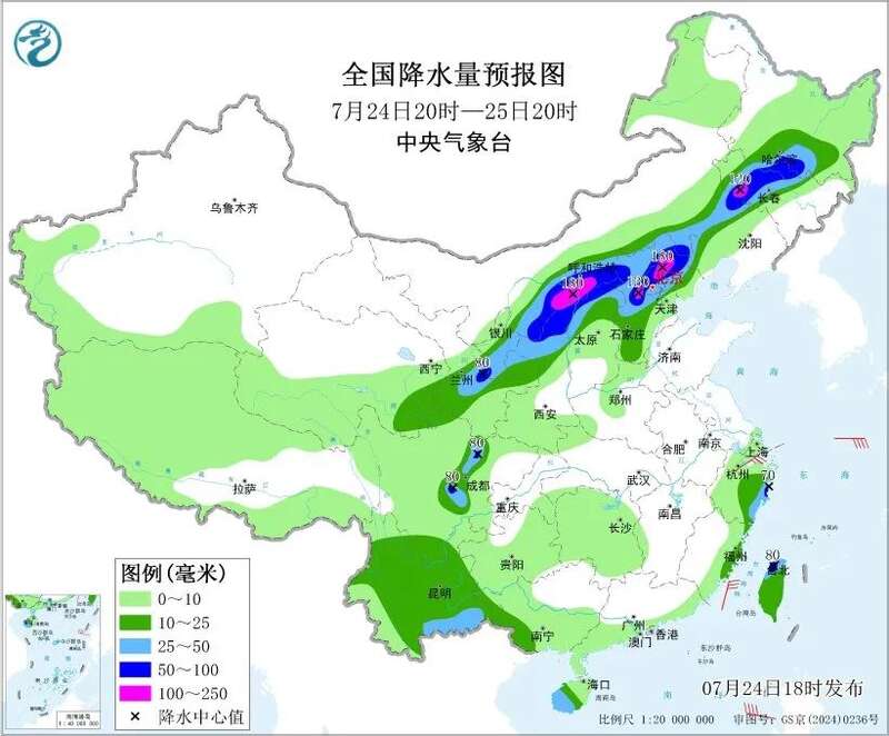 内蒙古中西部偏南地区、宁夏中南部、甘肃东部、陕西北部、山西北部、河北中北部、天津北部、北京、辽宁西南部、吉林中西部、黑龙江南部、四川盆地西部、云南南部、海南岛、浙江东部沿海、台湾岛北部等地部分地区有大到暴雨,其中,内蒙古中西部偏南地区、陕西北部、山西北部、河北北部和西部、北京西南部和东北部、吉林西南部等地局地有大暴雨。
