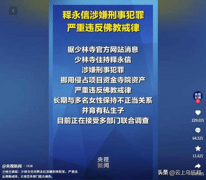 2025年7月27日,少林寺管理处发布一则通报,震惊全国,方丈释永信涉嫌刑事犯罪,包括挪用侵占寺庙资金,并长期与多名女性保持不当关系,甚至育有私生子。