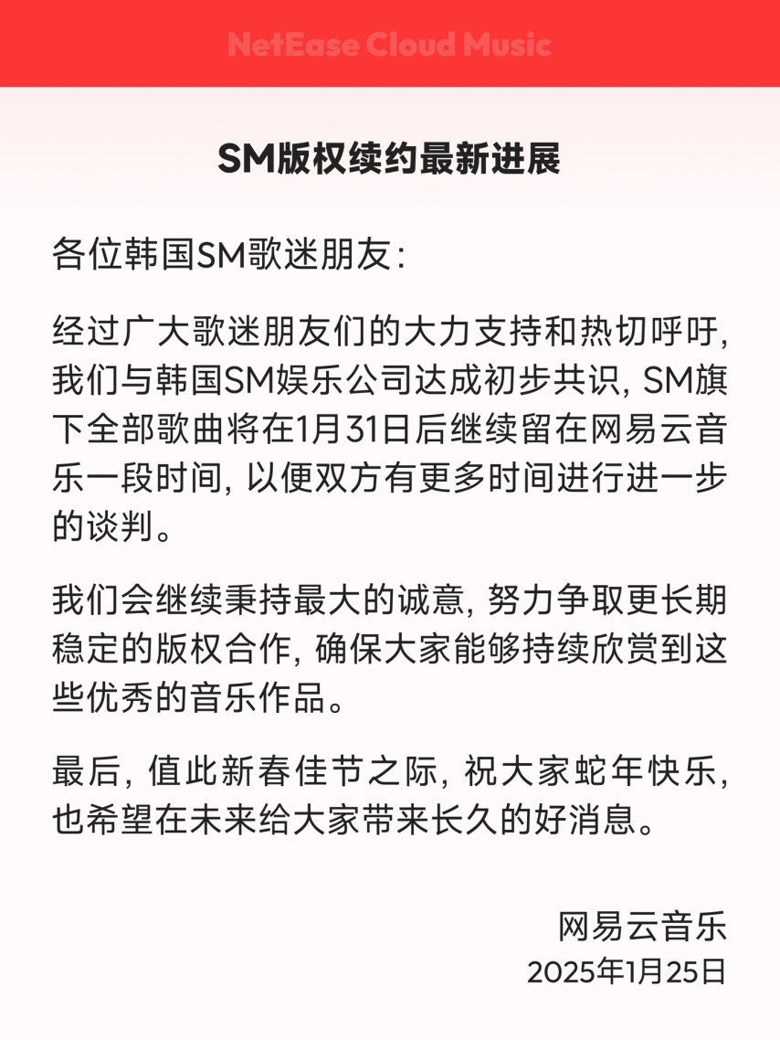 今年 1 月 24 日,网易云音乐发布《致韩国 SM 歌迷的一封信》,告知歌迷朋友,因版权方单方面通知不续约,2025 年 1 月 31 日,网易云很可能不得不下架韩国 SM 娱乐公司旗下全部歌曲内容。