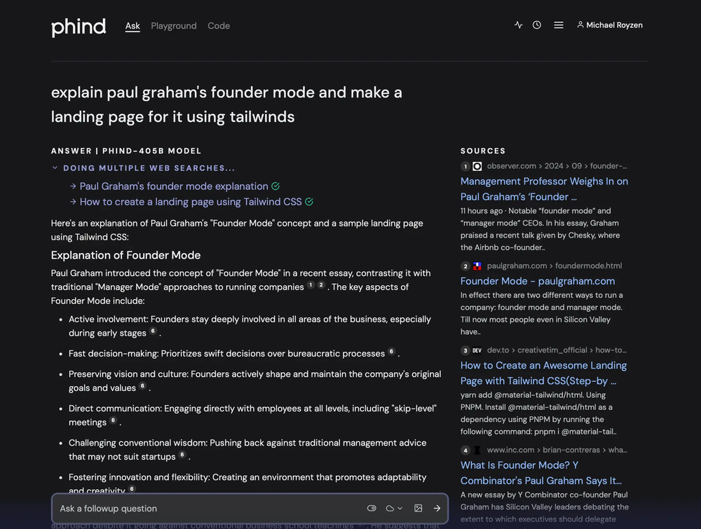 Phind-405B 在 HumanEval 上的得分为 92%,与 Claude 3.5 Sonnet 相当。我们对它在实际任务中的表现特别满意,特别是在设计和实施 Web 应用方面。 我们对技术主题的关注也使 Phind 能够很好地回答所有问题。我们认为,我们新的 Phind Instant 模型(与 Phind-405B 的训练方式类似)是快速获得互联网来源答案的最佳方式。