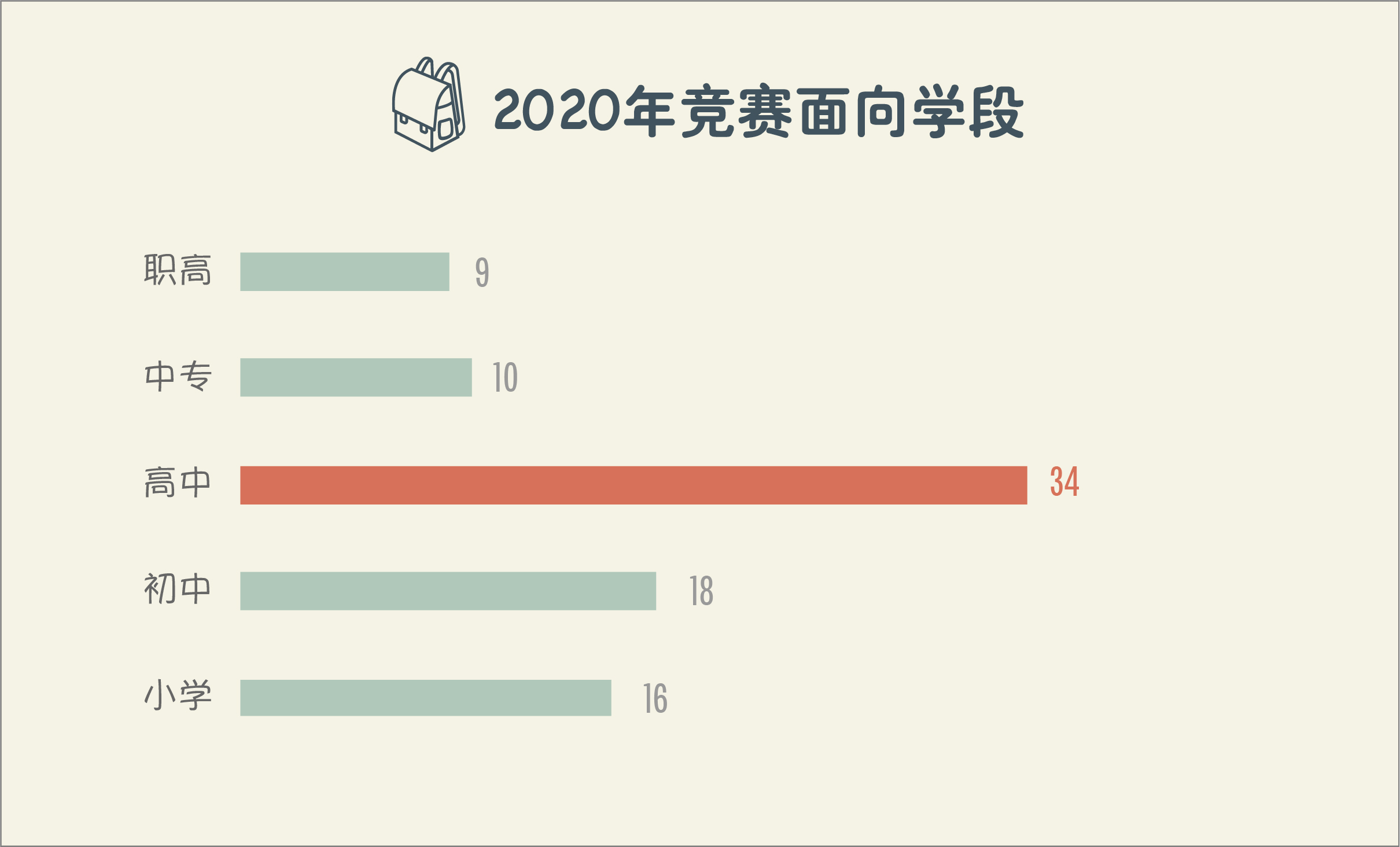 35项竞赛中,仅有一项未面向高中学段学生。相比去年,职高和中专学段也拥有了自己的合规竞赛活动。