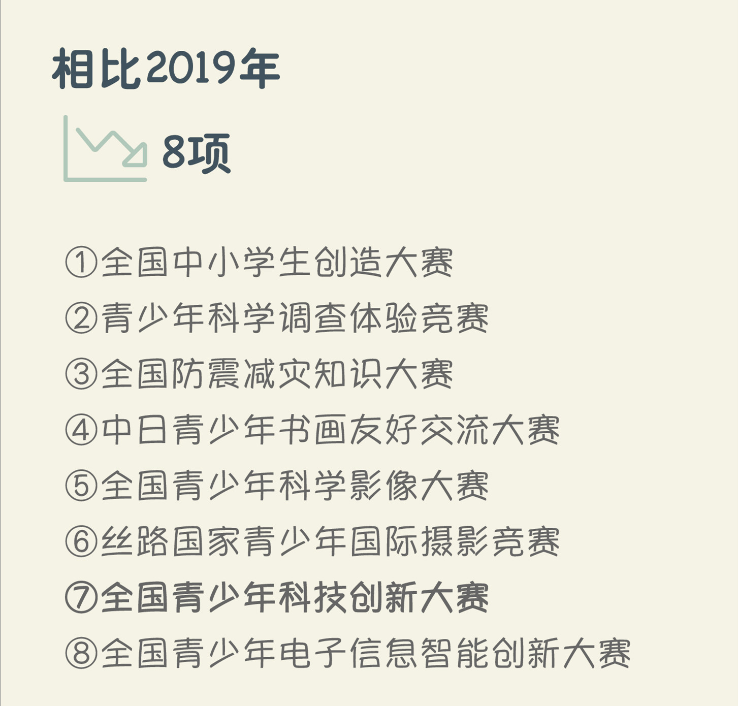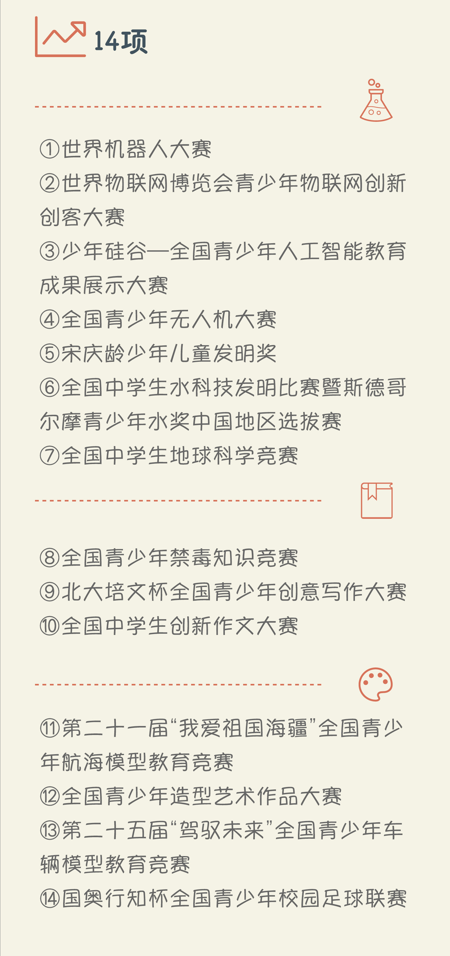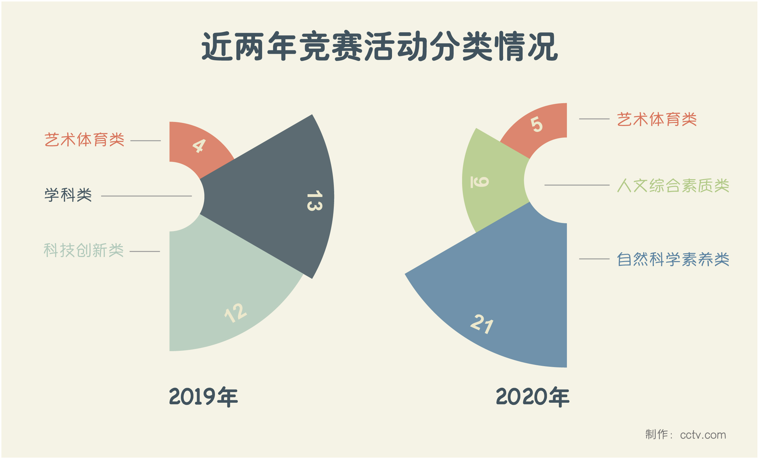 2019年,竞赛活动被分为科技创新类、学科类和艺术体育类,而在今年的名单中,除艺术体育类维持不变外,其他两项改为自然科学素养类和人文综合素质类。