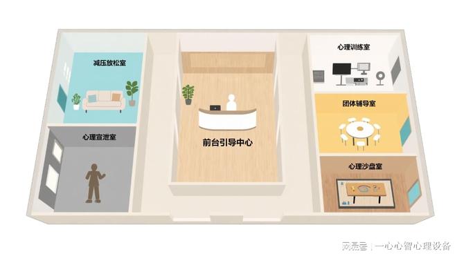 装修建议:墙面采用浅色系墙面乳胶漆,如淡米色、浅粉色等,配合温馨的灯光设计,营造出放松、亲切的感受。地板选用浅色系防滑地砖,不仅营造通透、大气的大空间概念,还能保障人员行走安全。墙上除了挂心理挂图和进行文化墙设计外,可安装一块电子显示屏,滚动播放心理中心的活动信息、心理科普知识等。同时,摆放一些小型的绿植和舒适的座椅,让学生在等待时能感到舒适。
