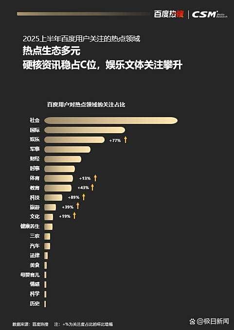 基于大量热点数据和深入分析,百度热搜与中国广视索福瑞媒介研究(CSM)联合发布了《2025上半年百度热搜报告》,详细解析社会、国际/军事、体育、娱乐等领域的热点事件,揭示用户生活方式与兴趣变化趋势,为行业提供参考。