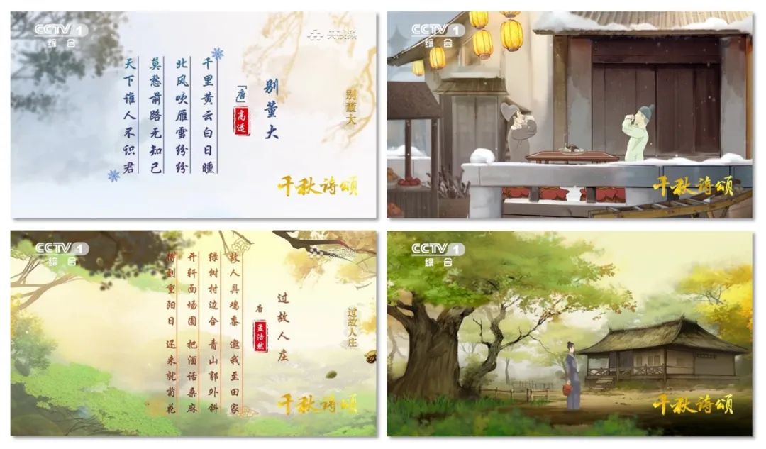 2023年7月,总台联合上海人工智能实验室发布了“央视听媒体大模型”,并首次应用于《千秋诗颂》的创作。《千秋诗颂》第一季综合运用可控图像生成、人物动态生成、文生视频等最新技术成果,将《咏鹅》《过故人庄》《黄鹤楼送孟浩然之广陵》等6首脍炙人口的唐诗转化为唯美的国风动画。