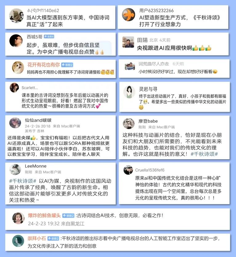 众多网友留言点赞“AI塑造新型生产方式,《千秋诗颂》打开了行业想象力”“当AI大模型遇到东方审美,中国诗词真正活了起来”“早点进入智慧中小学平台,方便师生使用”