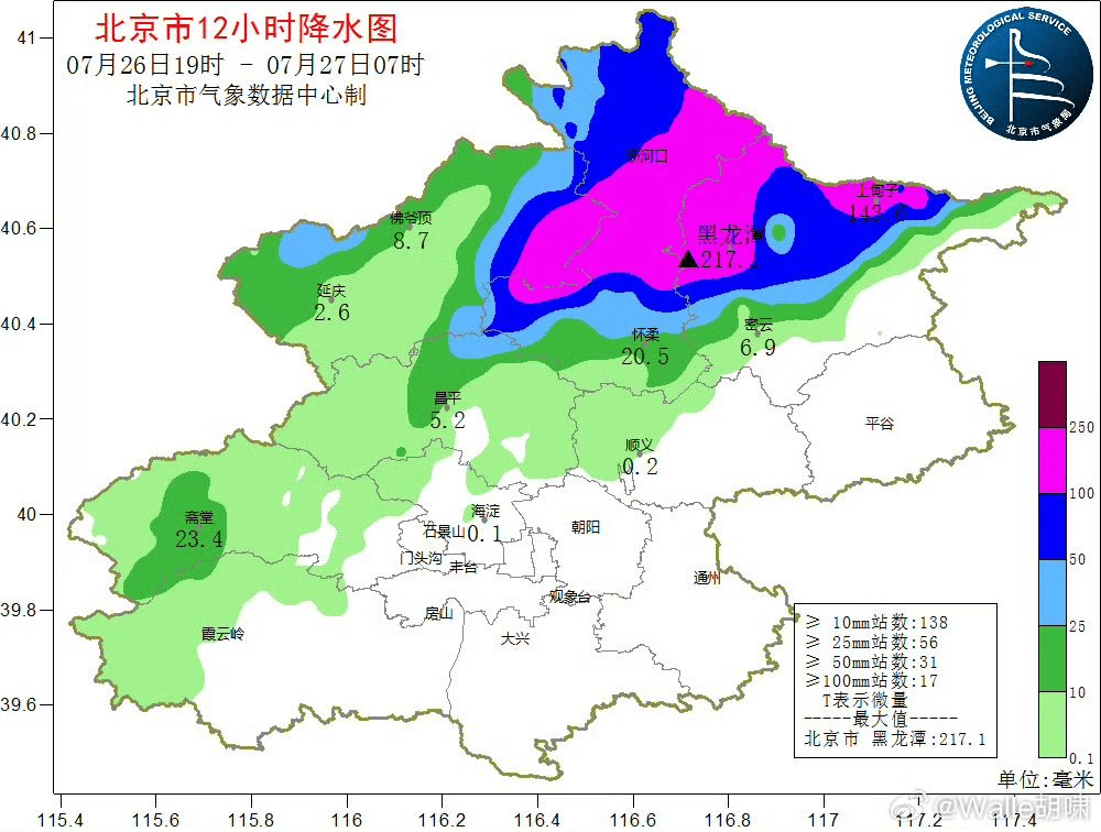 7月26日晚,北京市密云、怀柔、延庆三区相继发布暴雨红色预警,强降雨导致多地出现洪涝及地质灾害风险。7月27日,北京市规自委联合市气象局8时升级发布地质灾害气象风险红色预警,7月27日8时至7月28日8时,北京市延庆东部、怀柔中部和西南部,密云西北部发生崩塌、滑坡、泥石流等地质灾害风险很高(红色预警)。