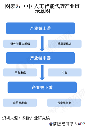 中国人工智能代理产业链已形成覆盖基础层、技术层、应用层的完整体系。在人工智能代理的产业链上,一般由硬件与算力的提供方提供运行大模型所需要的设备及环境,而模型提供方则是提供已经经过数据喂养和学习的大模型,之后由中游的平台与中台将已经完成整合的模型与外接服务器提供给产业链下游的应用开发和行业服务商。