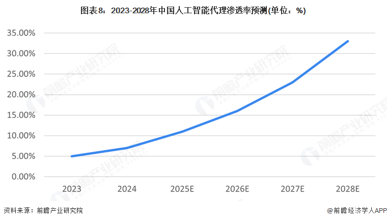 2023-2028年中国人工智能代理(AI Agent)的渗透率呈现出明显的增长趋势。2023年,AI Agent在企业中的渗透率不足5%,但随着技术的不断进步和应用场景的拓展,预计到2028年,大型企业的渗透率将增长至25%,而中小企业的渗透率也将提升至15%。这一增长趋势反映了AI Agent在各行业中的广泛应用和深入融合,预示着其将在未来几年内成为推动企业数字化转型和智能化升级的关键力量。