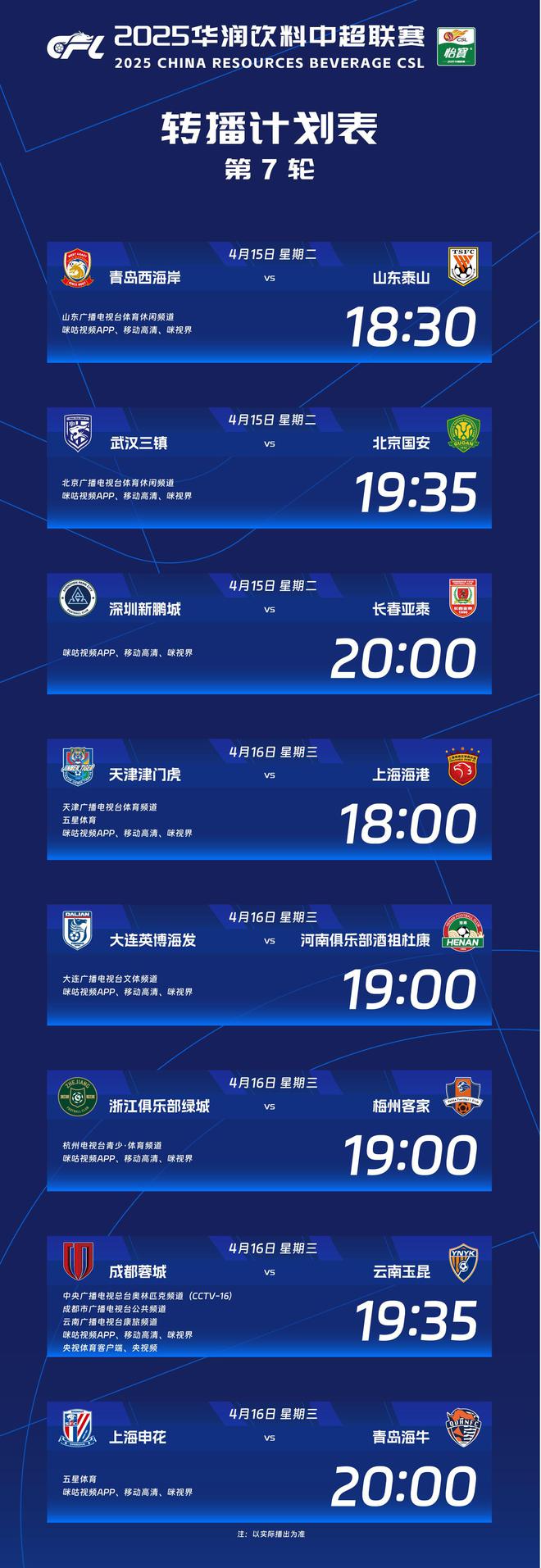 4月15日(星期二)、16日,2025赛季中超联赛将展开第7轮争夺。赛前,中超官方发布了本轮转播计划表。根据转播计划,除相关网络平台之外,本轮7场比赛还有电视平台直播。