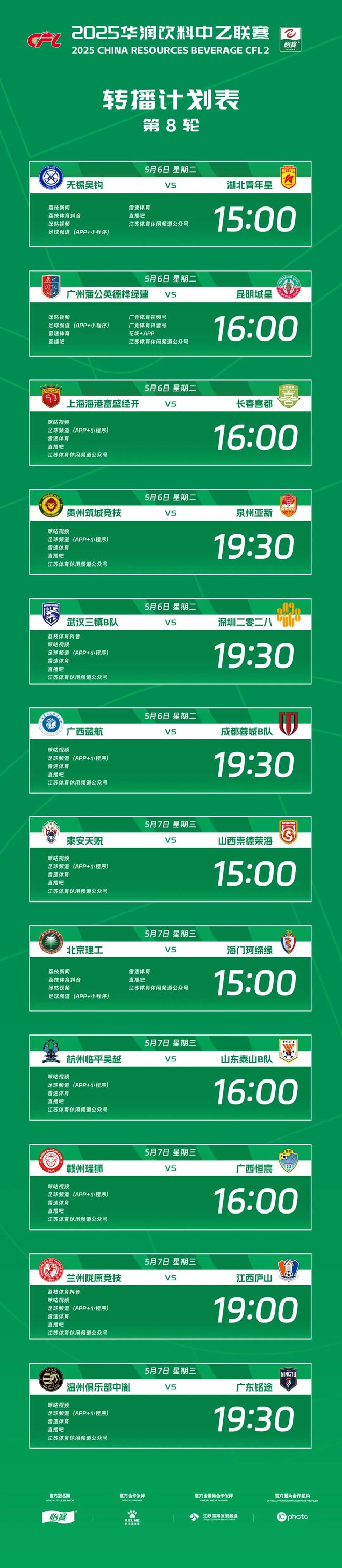 5月6日-7日,2025华润饮料中乙联赛将展开第8轮的较量,届时,多家平台将对比赛进行转播。敬请关注!
