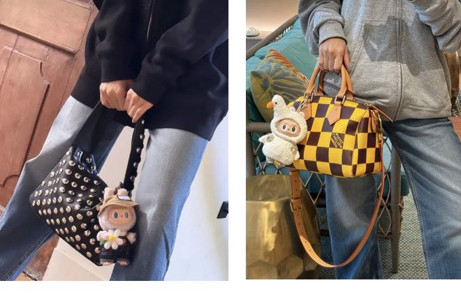 用LABUBU和不同颜色的CHANEL搭配也是时髦精们的最爱,这种搭配尤其适合小号手拿包或链条包,突出精致感的同时还能增添休闲趣味。