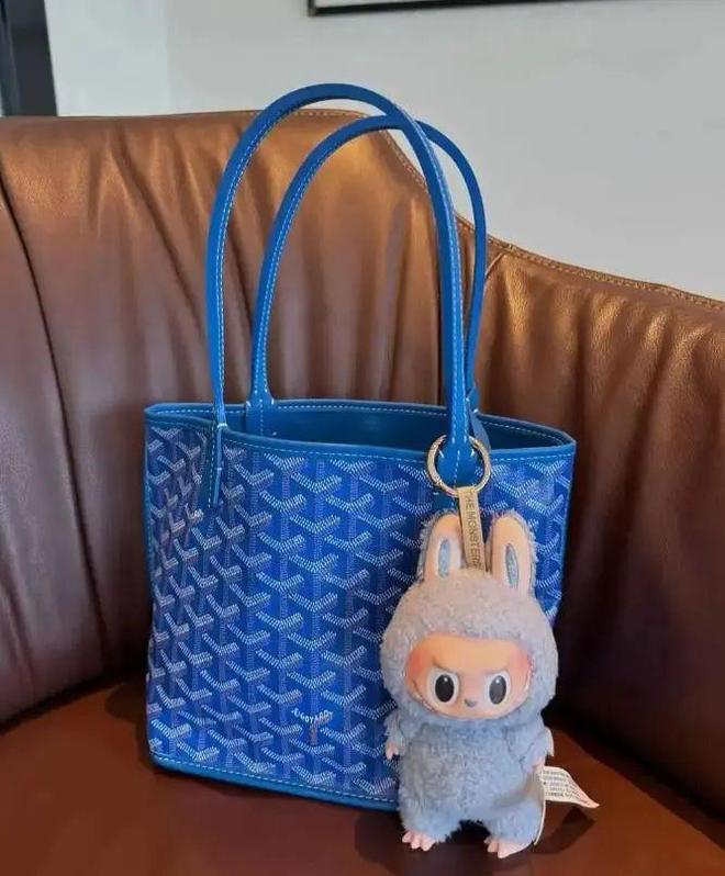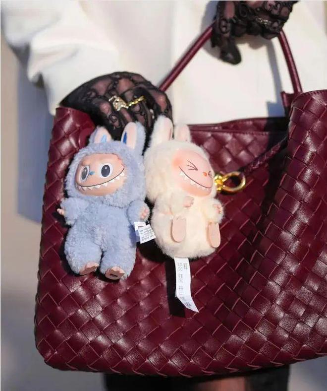 中大号的包包挂LABUBU也很合适,像是Goyard的购物袋的或者BV的编织包,配上LABUBU,就可以轻易地成为视觉焦点,瞬间点亮造型。