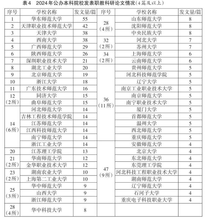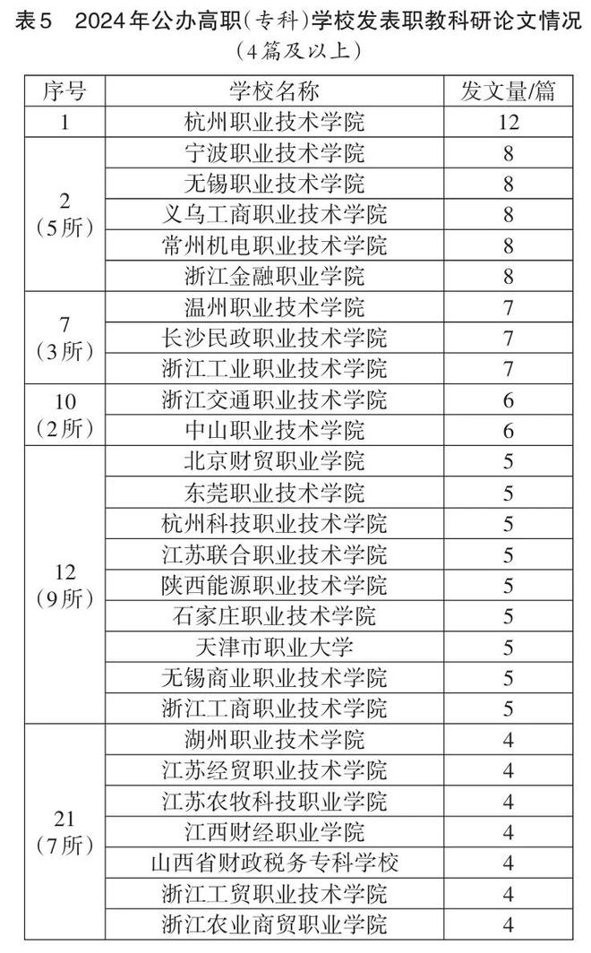 2024年职业教育科研高贡献机构中普通本科高校有:华东师范大学、天津职业技术师范大学、天津大学、西南大学、广西师范大学、陕西师范大学、湖北工业大学、北京师范大学、浙江大学、广东技术师范大学等;职业教育类高校有:深圳职业技术大学、金华职业技术大学、杭州职业技术大学、宁波职业技术学院、无锡职业技术学院、义乌工商职业技术学院、常州机电职业技术学院、浙江金融职业学院、温州职业技术学院、长沙民政职业技术学院、浙江工业职业技术学院等(后3所高职院校数据并列)。