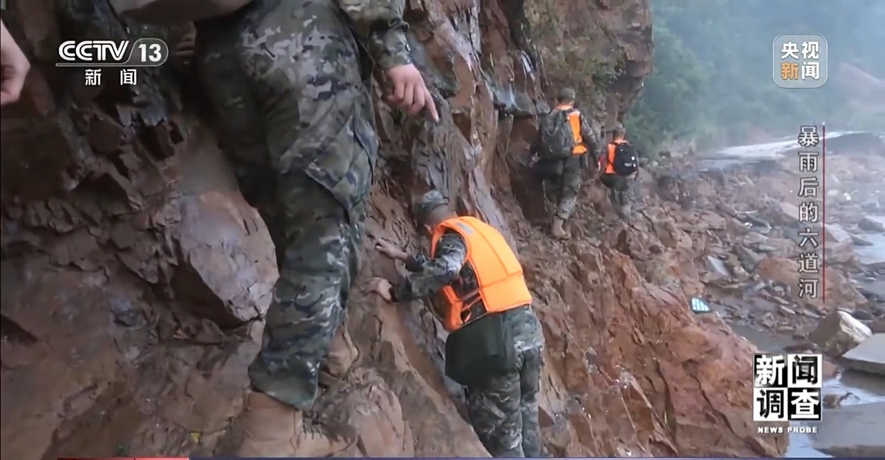 五道河村也受灾严重,沿崖壁而建的水泥村道被山洪完全冲毁,想要前进,必须在近乎90的绝壁上攀爬,崖壁最窄处几乎难以下脚。