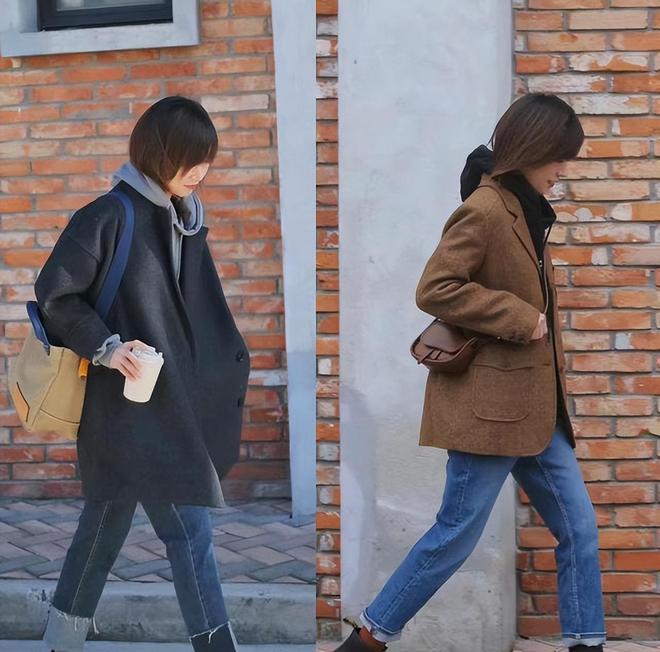 饱和度偏低的蓝色更显年轻,轻盈感适合小个子。 牛仔裤与格子毛呢大衣搭配,秋冬氛围感浓,不沉闷。