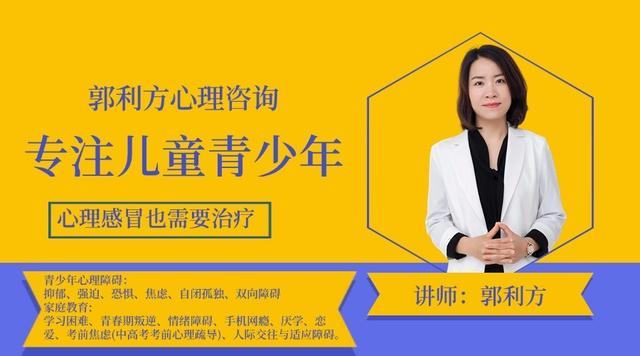 主讲人:北京著名青少年心理咨询师郭利方,国家心理咨询师、家庭教育指导师;毕业于中国政法大学,具有心理学、社会学、教育学多重背景,自2008年攻读心理学,多年的学习精神分析,认知行为治疗及家庭治疗,擅长于各类型儿童青少年心理问题,生涯规划和人际关系.对于治疗惊恐发作及焦虑抑郁经验丰富。