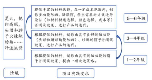 比如,在《做一顶帽子》的工程实践活动(见图1)中,针对同一情境任务,不同年段制定的项目实践要求明显不同。低年段只需要考虑帽子的遮阳功能,而高年段还需要考虑材料选择、成本等工程的限制因素,通过逐步递增限制因素的数量,培养学生统筹协调的思想;针对方案的设计与论证,从低年段只提出单一方案过渡到高年段需要充分探讨产品各个影响因素间的关系,综合论证自己或他人的设计方案;针对产品的制作与迭代,从低年段只提出改进策略,到高年段需要根据测试结果,有依据、有目标、更综合地去开展产品的迭代,最终将自己的设计创意变为现实产品,实现核心问题的解决。学生反复实践符合自己认知和能力水平的制作活动,工程思维得到有效培养。