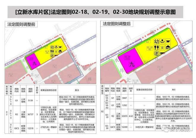 经规划主管部门审议并原则通过,拟对[立新水库片区]法定图则02-18、02-19、02-30地块规划进行调整。调整后: