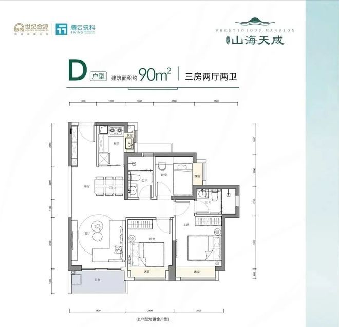 90㎡的3房2厅2卫,设计的是经典竖厅格局,客厅3.4米开间,餐客厅一体化,三开间朝南,3个卧室分别是3米/2.9米/2.5米的宽度,L型厨房,得房率:78.38%(不含赠送),阳台朝东南或西南朝向,本次推出来的2栋朝东南向,看花园景观。