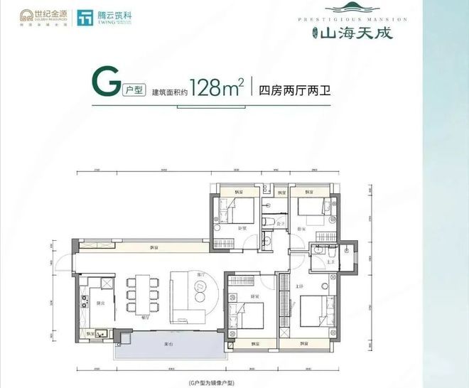 128㎡的4房2厅2卫,设计的是横厅南北通透格局,客餐厅6.3米开间,三开间朝南,4个卧室分别是3.5米/3米/2.9/2.8米的宽度,全屋飘窗,U型厨房,公卫三段式分离设计,得房率:81.07%(不含赠送),6.3米长的超大阳台,朝正南向看花园景观。