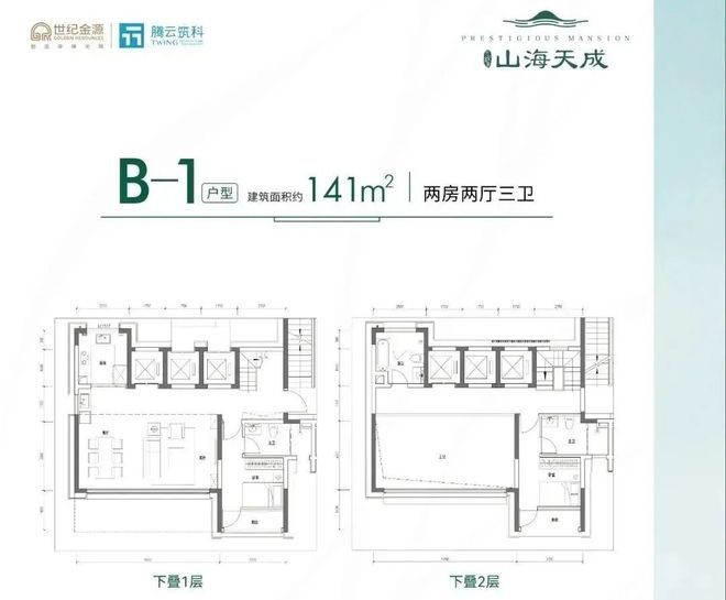 141-151㎡的复式洋房,上下2层,一层2户设计,客餐厅6.95米开间,中空客厅6米挑高,U型厨房,得房率86.17%(不含赠送),空间可塑性比较强。