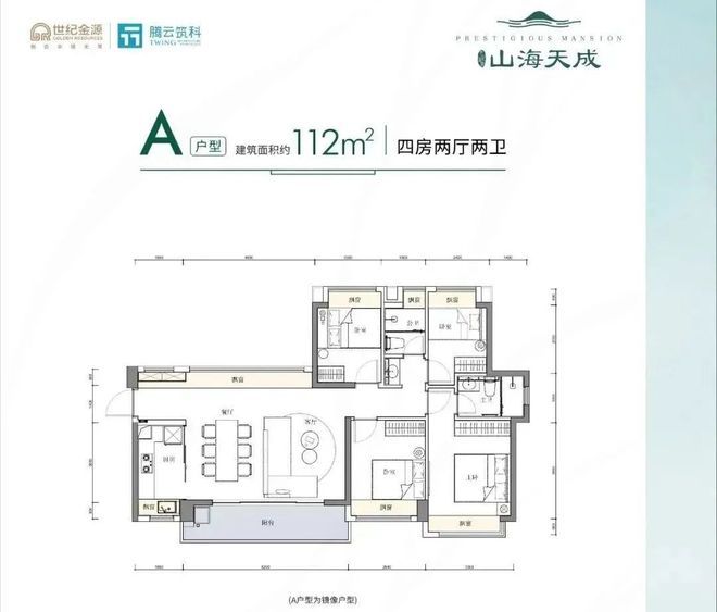 112㎡的4房2厅2卫,设计的是横厅南北通透格局,客餐厅6.2米开间,三开间朝南,4个卧室分别是3.3米/2.9米/2.5/2.4米的宽度,全屋飘窗,U型厨房,公卫三段式分离设计,得房率:80.14%(不含赠送),6.2米长的超大阳台,朝正南或西南朝向,看花园景观。