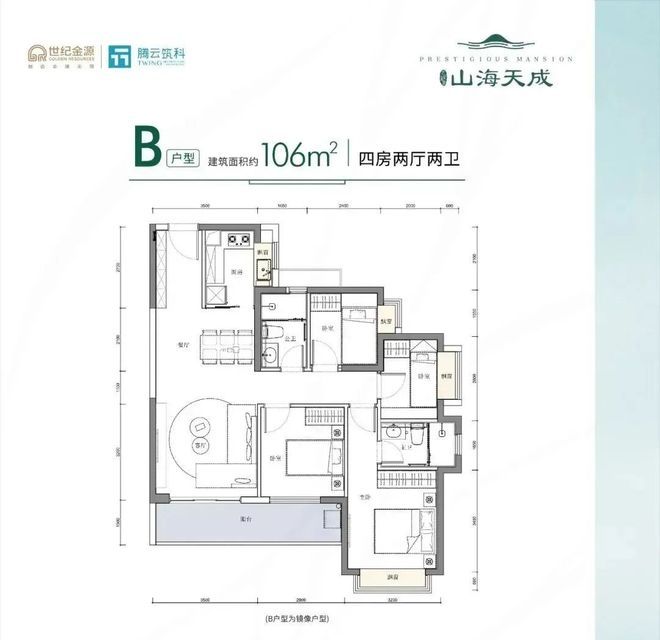 106㎡的4房2厅2卫,设计的是竖厅格局,客厅3.5米开间,三开间朝南,4个卧室分别是3.2米/2.9米/2.45/2米的宽度,L型厨房,得房率:80.14%(不含赠送),客厅连接卧室有1个6.4米长的超大阳台,朝正南或西南朝向,看花园景观。