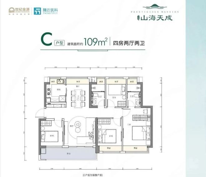 109㎡的4房2厅2卫,设计的是竖厅南北通透格局,客厅3.6米开间,四开间朝南,4个卧室分别是3.2米/2.9米/2.7/2.2米的宽度,全屋飘设计,U型厨房,得房率:78.39%(不含赠送),客厅连接卧室有1个6.3米长的超大阳台,主朝东南或西南向,看花园景观。