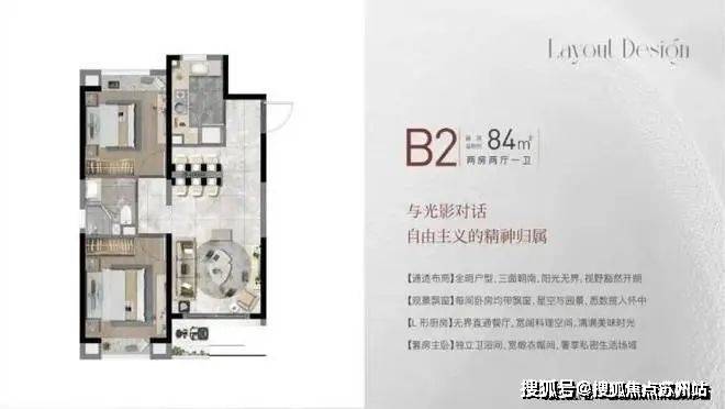 上海奉贤大名城映雨江南售楼处电线卫,做到了双开间朝南+双卧室带飘窗+动静分离,非常宽敞的2房户型。