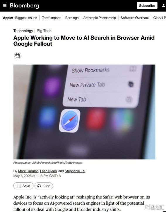 据彭博,苹果公司正积极考虑重塑其Safari浏览器,将重点转向由AI驱动的搜索引擎。苹果公司服务部门高级副总裁埃迪・库伊在美国司法部对Alphabet公司的反垄断诉讼中作证时透露了这一信息。该诉讼的焦点是苹果与谷歌之间每年约200亿美元(现汇率约合1441.84亿元人民币)的协议,从而使谷歌成为Safari浏览器的默认搜索引擎。