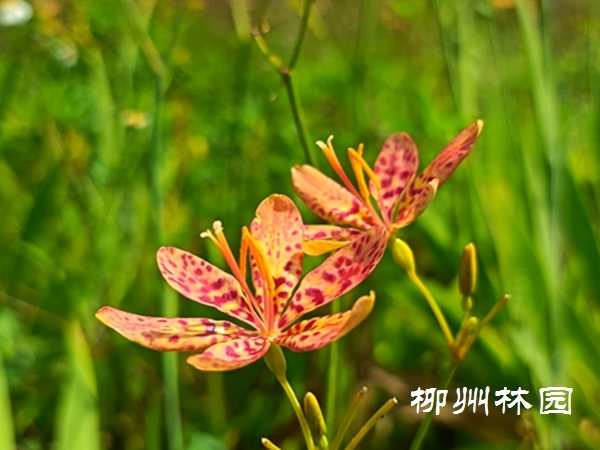 日前,在柳州市环江滨水大道上,一朵朵橘红色带深斑的蝶形花开在叶丛顶端,远远望去,像一群群振翅欲飞的小凤凰——这就是射干。