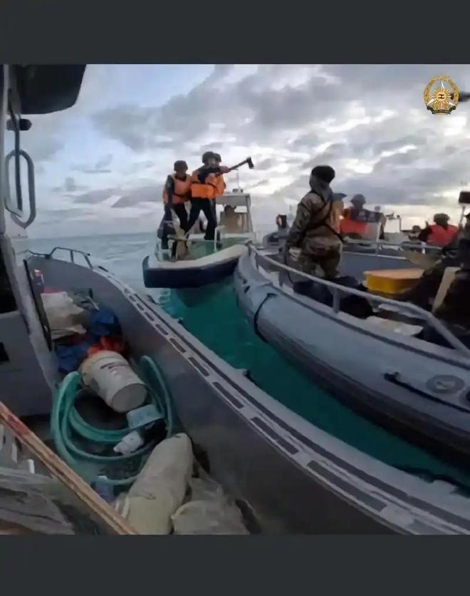 菲方船员随即向海警指挥台泼洒pH值低至2.3的强酸液体,腐蚀海警队员制服,并掏出M-16与AR-15步枪对峙,关键时刻,中国海警以斧头、甩棍等非致命武器直面枪口,高喊“有枪了不起?冲我来!”