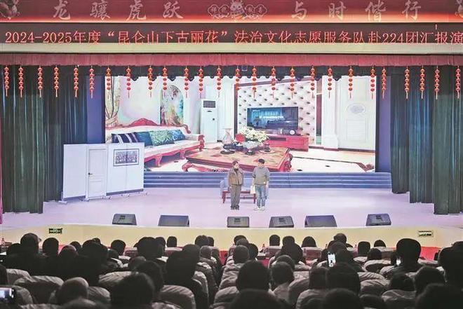 “昆仑山下古丽花”法治文化志愿服务队赴十四师二二四团开展汇报演出。图为十四师皮山农场和一牧场的专职人民调解员在表演普法情景剧(资料图片)。刘真真 摄