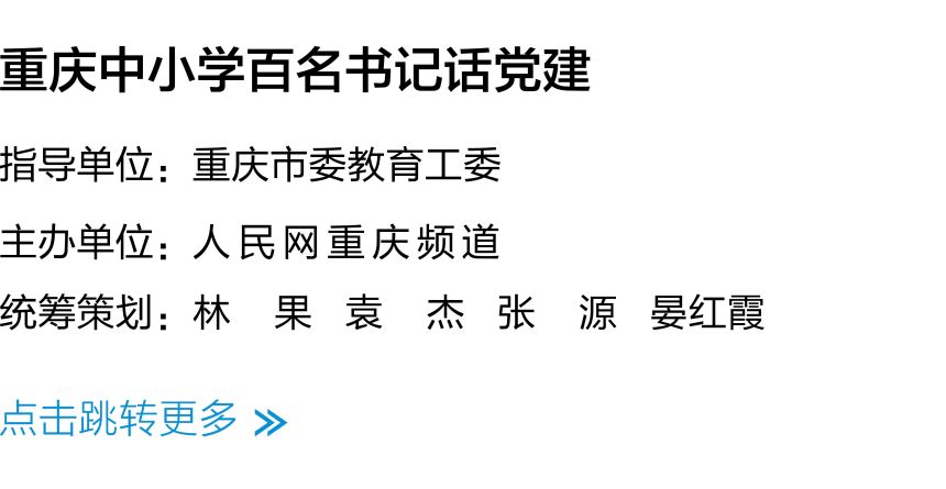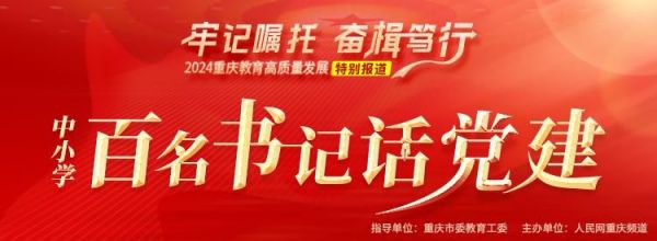 教育是国之大计、党之大计。坚持和加强党对教育工作的全面领导是办好教育的根本保证,是进一步办好人民满意的教育的关键所在。为全面贯彻新时代党的组织路线和党的教育方针,落实立德树人根本任务,重庆市委教育工委联合人民网重庆频道特别推出《重庆中小学百名书记话党建》特别报道,聚力抓学习、强堡垒、创品牌、育新人,促进中小学党建工作和教育教学双融合双促进双提高,努力为教育强市建设提供坚强保障,为新时代市域党建新高地建设贡献教育力量。