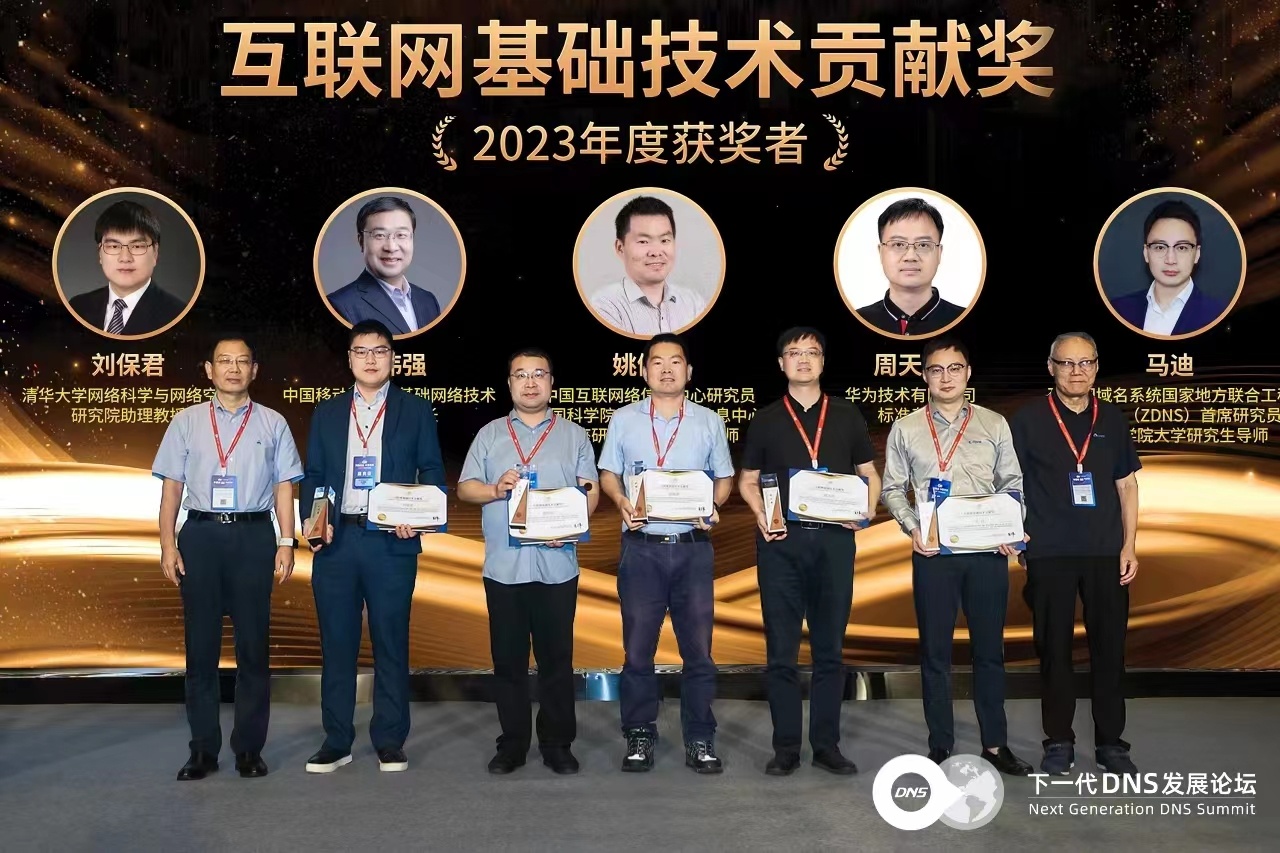 首届互联网基础技术贡献奖获奖者为:中国互联网络信息中心研究员姚健康、中国移动研究院基础网络技术研究所副所长程伟强、清华大学网络科学与网络空间研究院助理教授刘保君、中国移动研究院基础网络技术研究所副所长程伟强、华为技术有限公司标准专家周天然、互联网域名系统国家地方联合工程研究中心(ZDNS)首席研究员马迪。