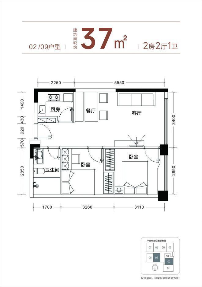 只有37㎡的小两房户型,总共5种不同户型,实际套内实用面积可达54-63㎡,使用率高达145%-170%。