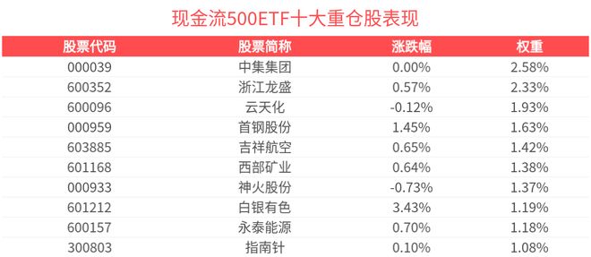 现金流500ETF紧密跟踪中证500自由现金流指数,中证500自由现金流指数从中证500指数样本中选取50只自由现金流率较高的上市公司证券作为指数样本,以反映中证500指数样本中现金流创造能力较强的上市公司证券的整体表现。数据显示,截至2025年7月31日,中证500自由现金流指数前十大权重股分别为中集集团、浙江龙盛、云天化、首钢股份、吉祥航空、西部矿业、神火股份、永泰能源、白银有色和指南针,前十大权重股合计占比45.03%。