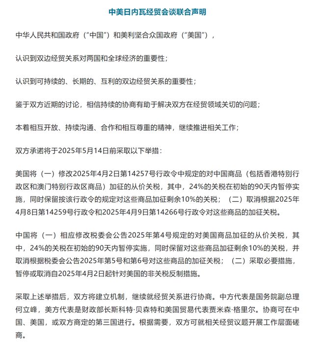 从5月10日开始会谈,5月11日宣布取得实质性进展,5月12日发布联合声明,5月14日前要采取行动降关税。