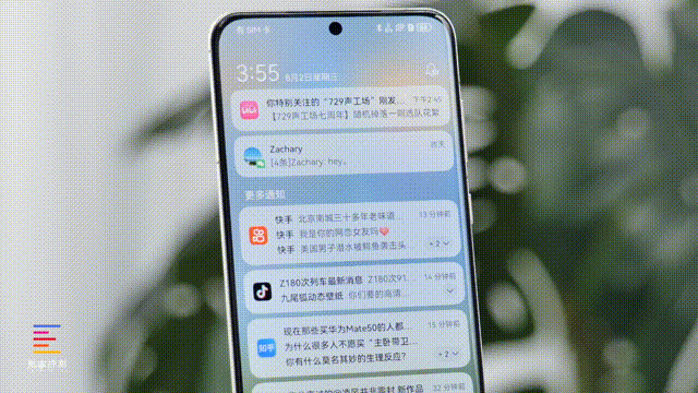 HarmonyOS的通知显示逻辑在这一代也做了调整,在锁屏或者通知中心,系统不再按照之前的时间顺序进行通知排序,而是按照实况窗、社交类通知、其他通知的顺序排列,分出了通知的不同优先级。