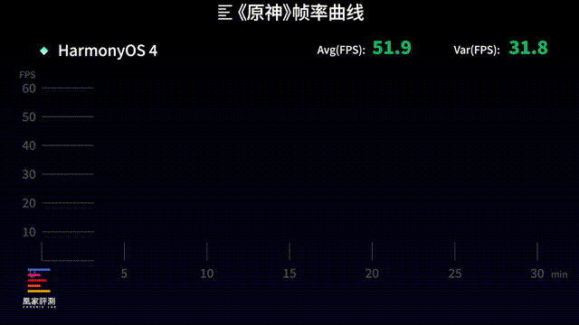 在25度室温、最高画质60帧的凰家评测原神3.0测试中,半小时下来的平均帧率为51.9fps,帧率波动方差为31.8,相比HarmonyOS 3的表现没有明显的变化。