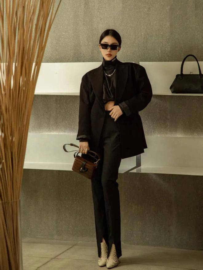 廓形外套可以说是打造强大气场的有力单品了,尤其是在肩膀的位置,融入一些垫肩的设计之后,更好的修饰我们肩膀的线条,对于肩窄溜肩的女生来说更加的霸气洒脱,而且增加了肩膀的宽度。能够快速提升整体造型的霸气感。