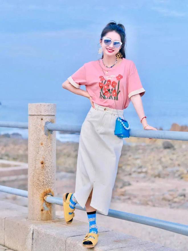 粉色的印花T恤搭配一条米白色的直筒开叉半身裙,简洁大气,时髦精致又温柔,可以轻松穿出满满的时尚感和优雅感,还带着几分俏皮,夏天这么打扮也太合适了吧。