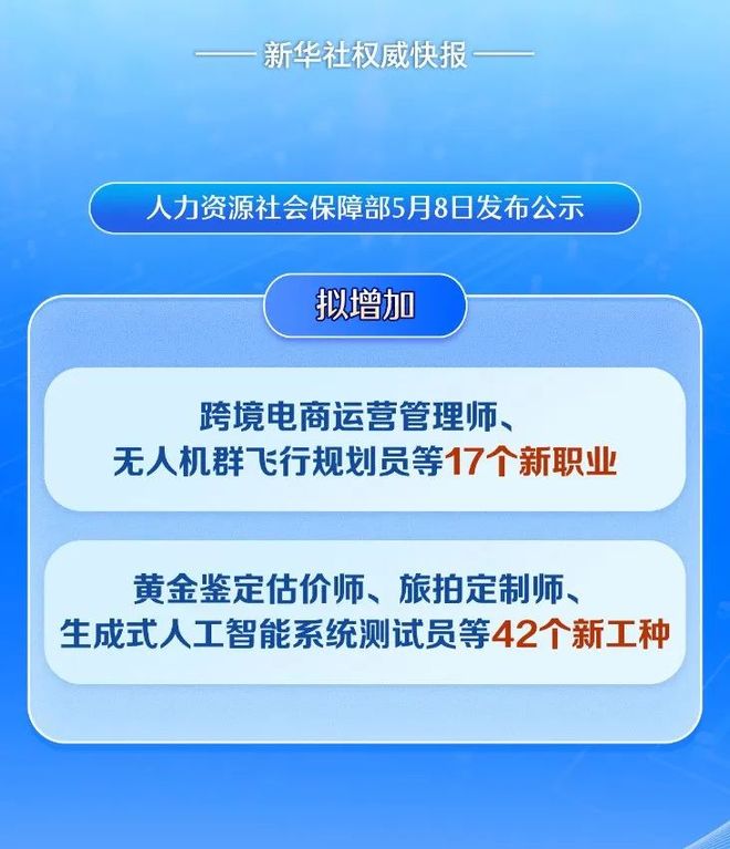 ◆ 人社部8日发布公示,拟增加跨境电商运营管理师、无人机群飞行规划员等17个新职业; 增加黄金鉴定估价师、旅拍定制师、生成式人工智能系统测试员等42个新工种。