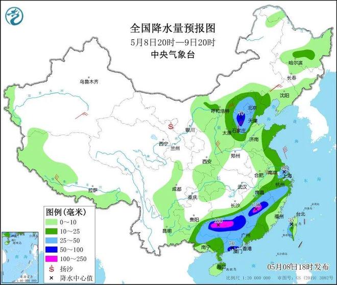 8日20时至9日20时,华北中部和北部、黄淮东部、江淮东部、江南中东部和南部、华南大部等地部分地区有中到大雨。温馨提示:南北方均有降雨且伴有强对流天气,公众需注意关注预报、预警信息,尽量避免在强对流活跃时段外出或在外游玩,出行请注意交通安全。