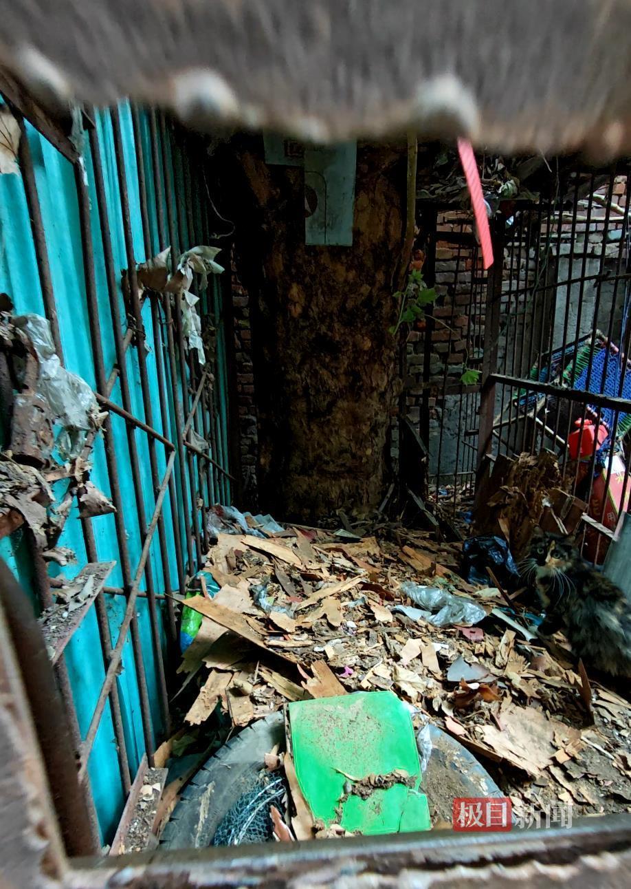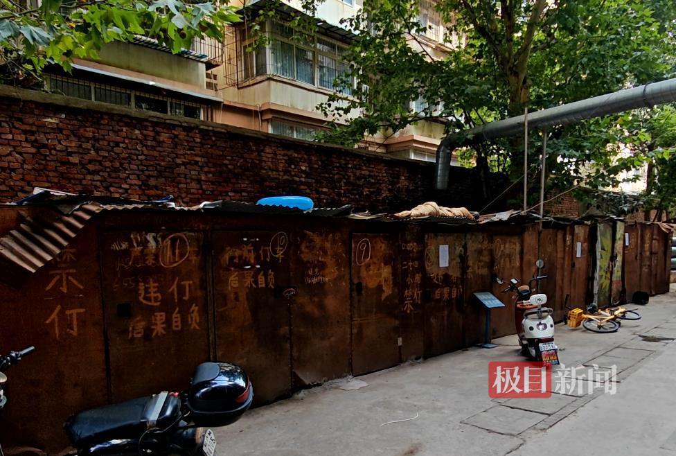 8月4日下午,极目新闻记者来到现场。在与楼栋相隔不到十米的围墙处,一排用角铁和铁皮搭建的小房子映入眼帘,共有近20间,目测长度约40米,几乎有大半栋楼长。这些锈迹斑斑的铁棚大门紧锁,透过门缝,可见部分车棚已废弃,堆满杂物,大多数则停放着电动车,五六个车棚上方还有充电线从对面楼房引入。站在二楼俯视,车棚上方垃圾遍布,废弃棉絮、轮胎、水瓶等随处可见。